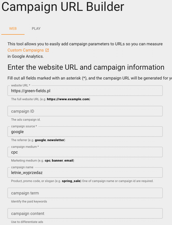- Popularnością cieszy się generator Google „Campaign URL builder”, w którym wystarczy wpisać nazwę strony, rodzaj kampanii, typ medium.